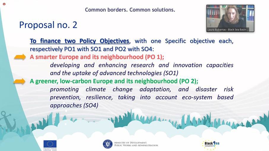 Karadeniz Programı, 2021-2027 döneminde Akıllı Avrupa Politika Hedefi (PO1) altındaki “Araştırma ve yenilikçilik kapasitelerinin artırılması ve geliştirilmesi ile ileri teknolojilerin yükseltilmesi” özel hedefi ile Daha Yeşil Avrupa Politika Hedefi (PO2) altındaki “İklim değişikliğine uyum, afet riskinin önlenmesi ve dayanıklılığın desteklemesi ile ekosistem temelli yaklaşımların dikkate alınması” ve “Doğa ve biyoçeşitliliğin korunmasının ve kentsel alanlar dahil yeşil altyapının güçlendirilmesi, ve her çeşit kirliliğin azaltılması” özel hedefine yönelik projelere destek sağlayacaktır. Ayrıca, yeni dönemde uygulanacak stratejik proje de iklim değişikliği, afet riski, ekosistem, biyoçeşitlilik, yeşil altyapı ve kirliliğin azaltılmasına dair çevreyle ilgili özel hedefler kapsamında gerçekleştirilecektir.